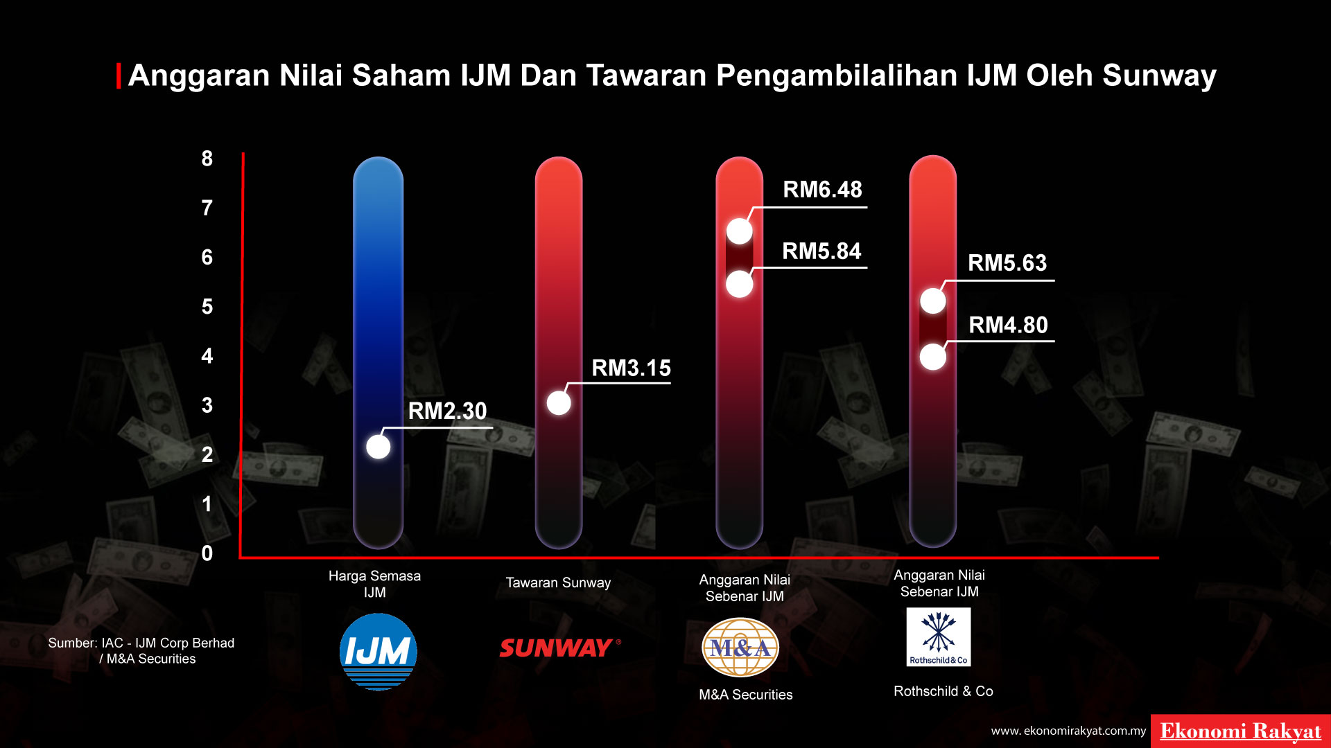 Rothschild & Co, yang turut dilantik sebagai penasihat bebas, menganggarkan nilai ekuiti IJM antara RM16.81 bilion hingga RM19.72 bilion, bersamaan RM4.80 hingga RM5.63 sesaham. Anggaran ini masih lebih tinggi daripada harga tawaran Sunway dan harga pasaran semasa IJM iaitu sekitar RM2.30 sesaham.