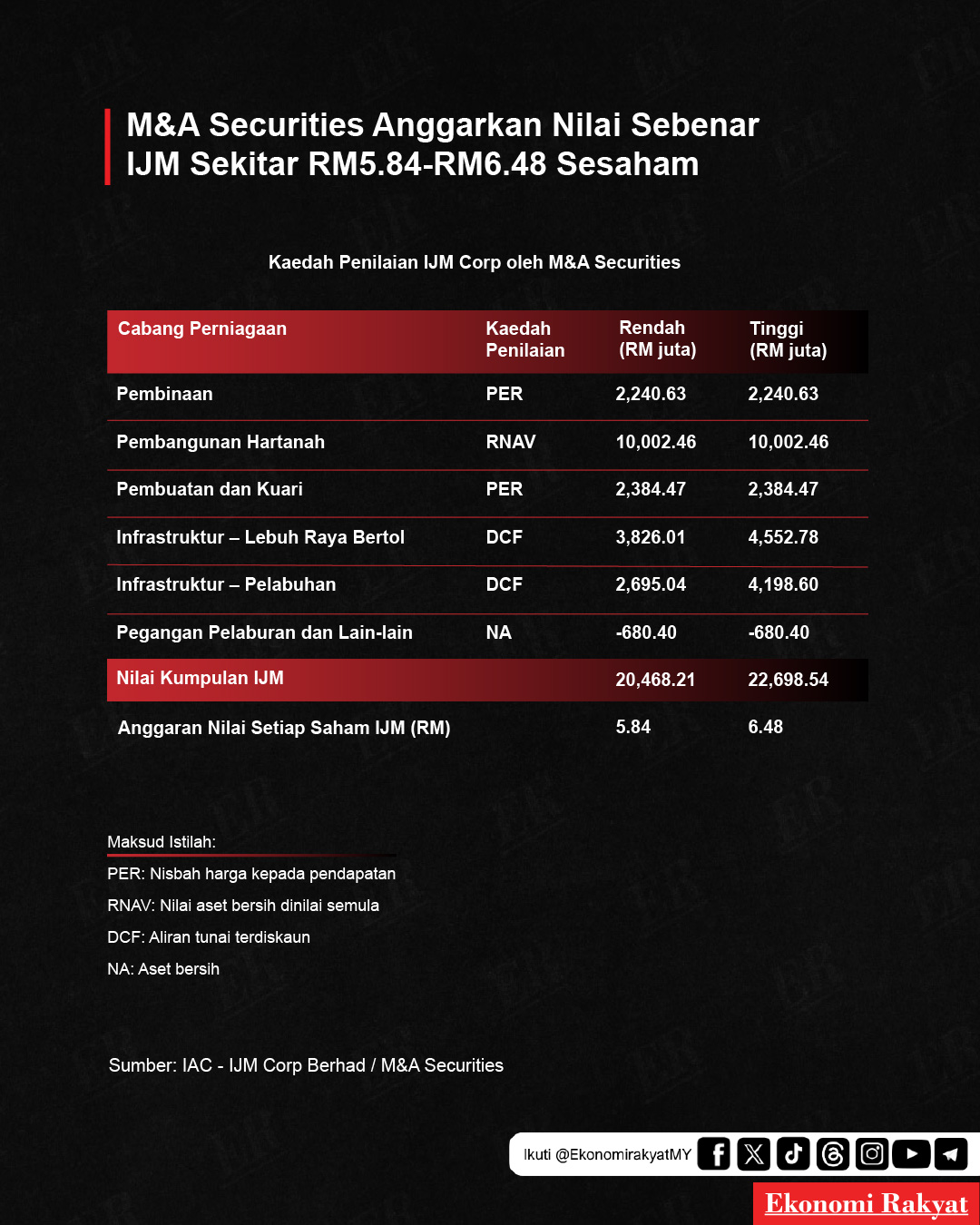 Firma kewangan M&A Securities telah dilantik oleh IJM untuk menjalankan penilaian bebas terhadap nilai sebenar IJM. Dalam Independent Advice Circular bertarikh 13 Mac 2026, mereka menganggarkan nilai ekuiti IJM berada diantara RM20.47 bilion hingga RM22.71 bilion.