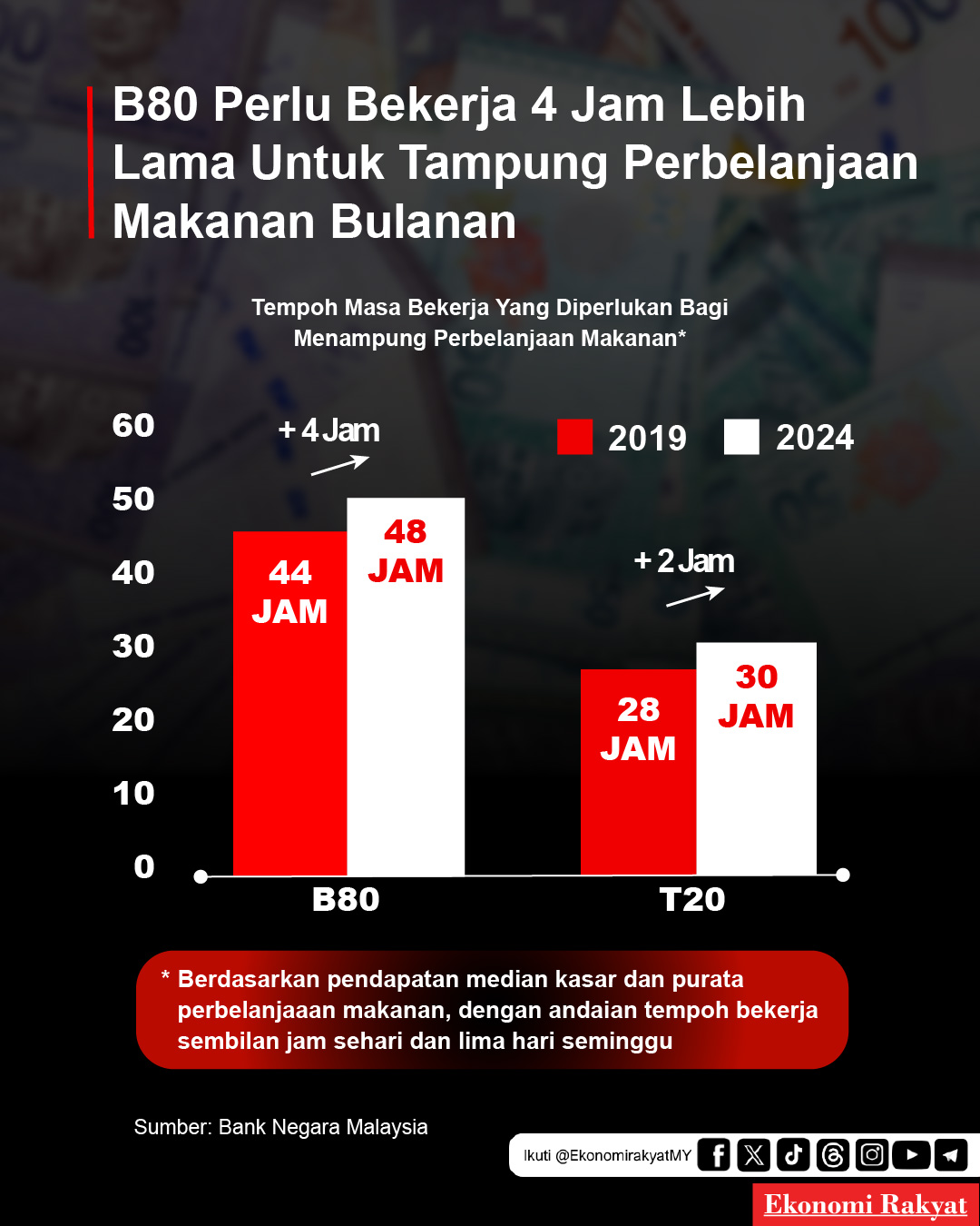 Hakisan kuasa beli paling jelas dapat dilihat melalui jumlah jam kerja yang diperlukan untuk menampung keperluan asas. Mengikut kajian BNM bagi tempoh 2019 hingga 2024, kumpulan B80 kini perlu bekerja 48 jam berbanding 44 jam sebelum ini untuk menampung perbelanjaan makanan bulanan.