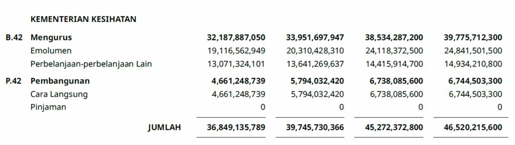 Kementerian Kesihatan umpamanya hanya menerima RM46.5 bilion, ataupun 2.2% berbanding KDNK Malaysia, peningkatan RM1.3 bilion (+2.9%) pada tahun ini.