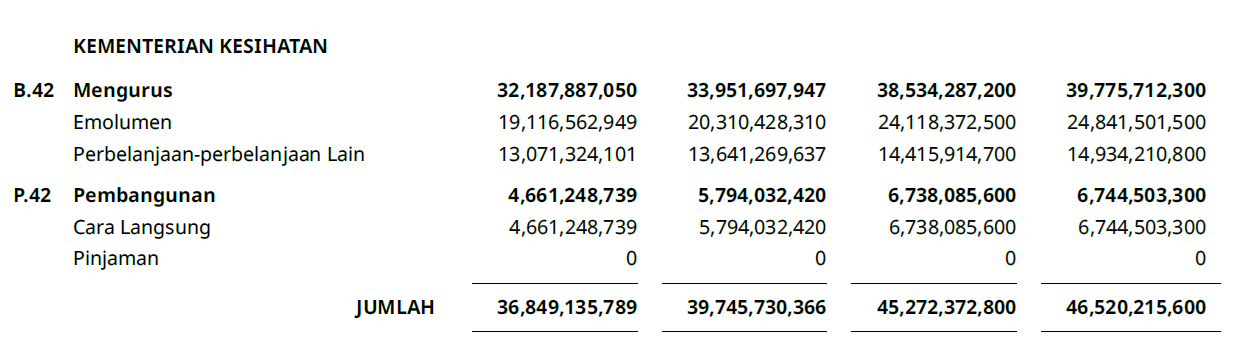 Kementerian Kesihatan umpamanya hanya menerima RM46.5 bilion, ataupun 2.2% berbanding KDNK Malaysia, peningkatan RM1.3 bilion (+2.9%) pada tahun ini.