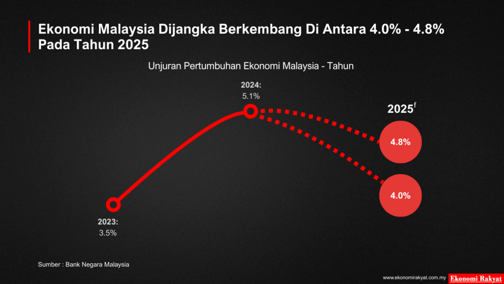 Gabenor BNM, Dato’ Sri Abdul Rasheed Ghaffour berkata ekonomi Malaysia diunjurkan berkembang di antara 4.0% hingga 4.8% pada tahun 2025, lebih rendah berbanding unjuran awal di antara 4.5% hingga 5.5% yang ditetapkan pada pada Mac lalu.