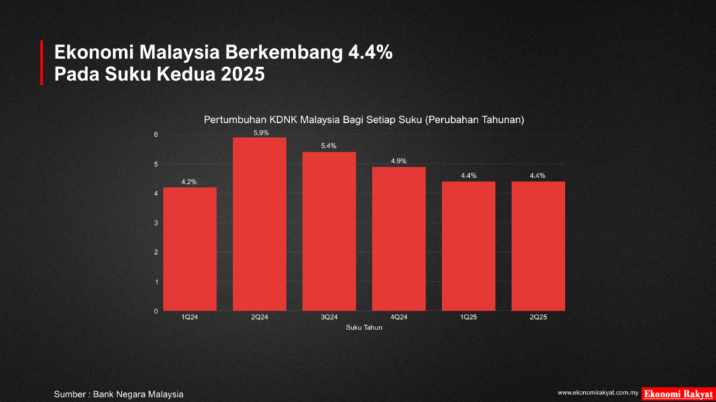 Ekonomi Malaysia berkembang 4.4% pada suku kedua tahun ini, susut berbanding 5.9% pertumbuhan yang direkodkan pada tempoh yang sama tahun lalu. Bank Negara Malaysia (BNM) melaporkan perbelanjaan isi serta permintaan berterusan barangan elektrik & elektronik dan aktiviti pelancongan memacu pertumbuhan pada suku kedua 2025.